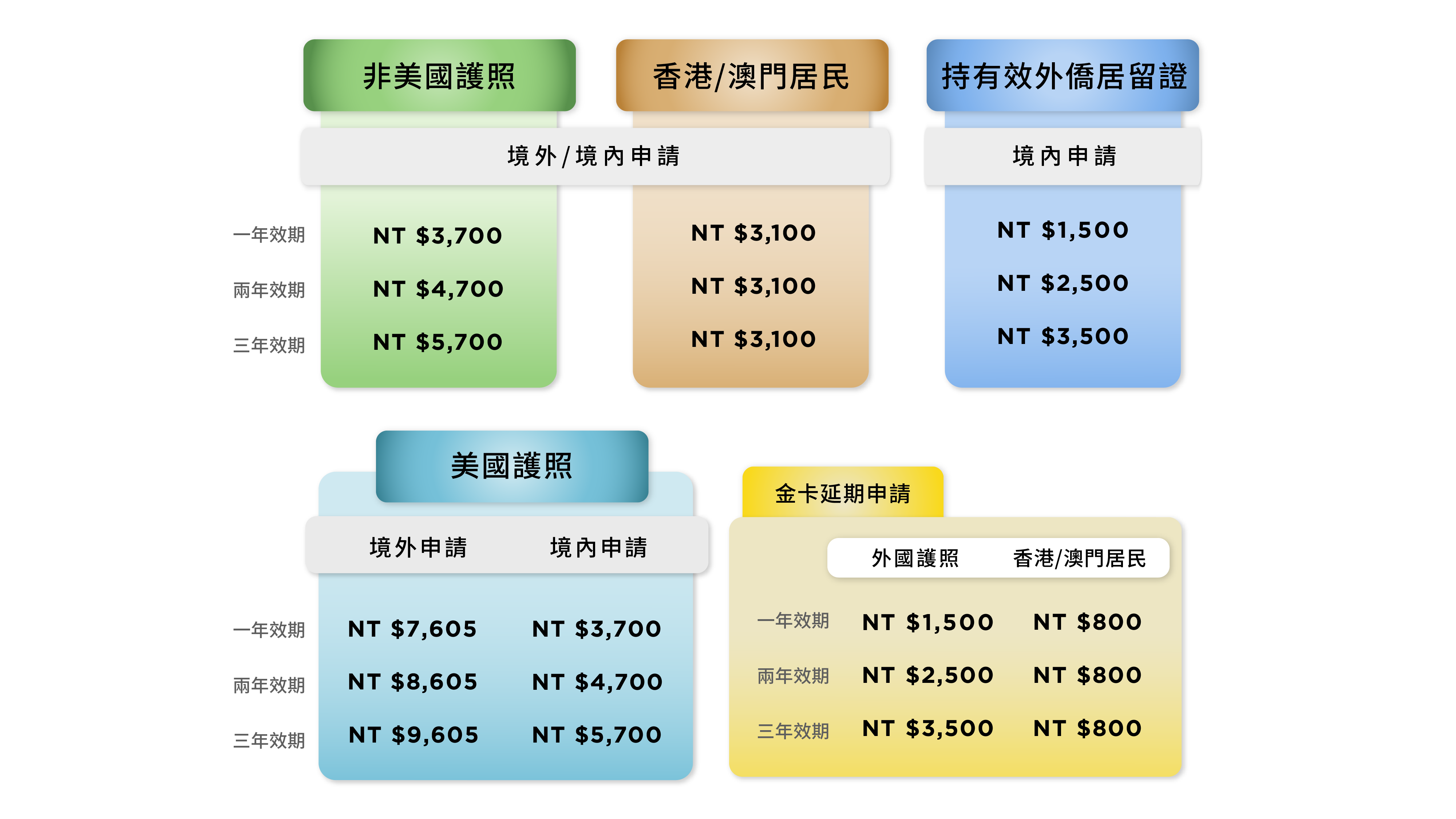 持美國以外國家護照:一年效期:新臺幣3,700元整;二年效期:新臺幣4,700元整;三年效期:新臺幣5,700元整。 持美國護照,國內申請:一年效期:新臺幣3,700元整;二年效期:新臺幣4,700元整;三年效期:新臺幣5,700元整。 持美國護照,國外申請:一年效期:新臺幣7,605元整;二年效期:新臺幣8,605元整;三年效期:新臺幣9,605元整。香港或澳門居民:一年效期至三年效期:新臺幣3,100元整。境內申請持有效外僑居留證:一年效期:新臺幣1,500元整;二年效期:新臺幣2,500元整;三年效期:新臺幣3,500元整。金卡延期申請持外國護照:一年效期:新臺幣1,500元整;二年效期:新臺幣2,500元整;三年效期:新臺幣3,500元整。香港或澳門居民:一年效期至三年效期:新臺幣800元整。